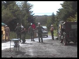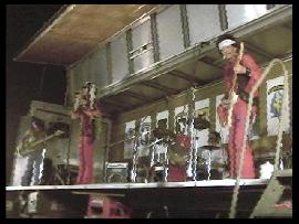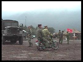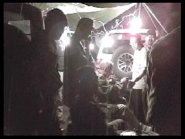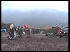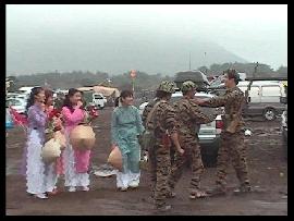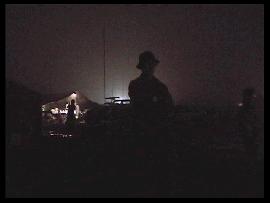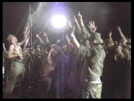 ・ 夜 いよいよ闇は深くなり、「夜」の時間が始まる。 さすがの山岳地帯で一気に雲のような霧が起こるほど湿気が多い。 だが霧の加減が撮影には良い特殊効果だ。 ステージではバンドのお姉さん方が唄い、文句ナシに盛り上がる。 興奮して暴れる兵士達(笑)。ステージをガードするMP達(^_^)。 「今年のMPは人数多いしキビシィ!!」とポマード氏。 そう言われるMP達は、その役柄通りニコリともせす任務を完遂、さすがである。