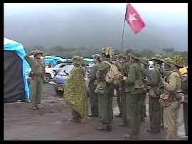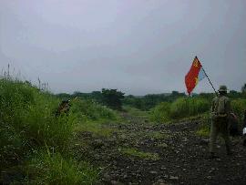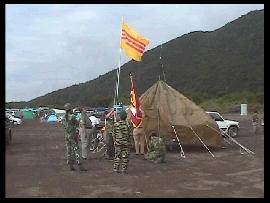 ・ 初ヴェトナム料理 自分はヒマだったのでウロウロと徘徊をしていたのだが、ショップエリアの中央部に、とある飲食店を発見した。 なんと、というか いかにも、というかベトナム料理のお店である。 メニューも、フォー(ベトナムうどん)や生春巻き、お粥、デザートなど多彩。 一応食料は色々と(横浜海軍ドライカレー(市販品)とか)持ってきてはいたのだが、ベトナム料理(香草は一切入ってなかったケド)を食べられるこんな機会は滅多にないので、終始このお店でを食事をとる事となる(笑)。 てゆ〜か、フォーを食べたのも初めてだったのだが、実にウマイ! 米の麺と知識では知っていたが、ホントにベタベタもしてないし、美味しい。 ダシはやや「酸っぱい」スープで、他に生肉(しゃぶしゃぶ状態)と生野菜が入っていた。 本場ではドクダミとかも入っているんだよ、と調理していた女性の方に教えて貰った。 スープも全部飲んで、ぷー、満足! これで本日のお昼ご飯終了。 もーちょっと余裕を持って昼食を食べれば(もしくは後から食べるとか)よかったのだが、 お陰で直後に始まるブリーフィングで地獄を垣間見ることになる。 ・ ブリーフィング ハイキング 1200時より共産軍のブリーフィングが始まった。 「土地に強い共産軍を目指す」というキャッチコピーで、約1時間フィールドを一回り。 聞いてはいたが、フィールドは実に広大。 アップダウンも激しく、しかも地面は溶岩と火山灰で固く、痛い。 漫画「SPRIGGAN」第1巻で、優ちゃんが「固まった溶岩で手を切るぞ」と言っていたのを思い出し、 気を付けてみる馬鹿がここにいる(大笑)。 移動が始まってしばらく経った時、妙にお腹が痛いのに気が付いた。 時間が経つごとに痛みは増し、なんか横隔膜が破れるように痛い! でもここで皆さんとはぐれたらキャンプへも帰れないので(笑)死ぬ気で後を追いかける。 元気だったら率先してケモノ道の案内にも付いていったろうに!なんか悔しいニャあ。 多分幽鬼のように青い顔をしつつ歩いていたに違いない。 結局、フィールド説明はおろか、復活方法などの基本ルールすら理解できぬまま帰路につくのであった(涙)。 そして寝床のターフの所に戻り、水分補給にビールを1本。 するとアラ不思議。痛みはスグに収まりました。これで夜のイベントもOKだ!(笑) ・ BGM 夕方、まだ明るい内から慰安(笑)のバンドの方々がリハーサルをしている。 軍用テントエリアに流れる音楽。 兵士の運転するジープには、バンドのお姉さんがたが3人ほど乗って「キャー!」とか言いながら走り抜け、 機銃に弾薬箱を取り付けるトラックの横を、菅笠かぶった農民がバイクで走り抜ける。 兵士達は談笑しながら道を横切り、傍らでは工兵が黙々と土嚢袋を作る・・・。 あ〜ホンマのベースってこんなカンジなんだろうな〜と思ってみる。