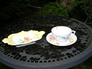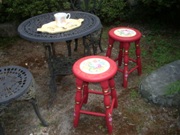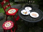 お庭でお茶でもいかが? 背付きいすは子供いすのリフォーム。手前の丸いすも大昔のいすのリフォーム。食器はオーブンポーセレンです。 オーブンポーセレンはオーブンで30分焼くだけで水洗いも出来るのでとてもお手軽。 |