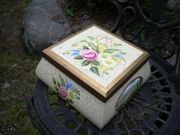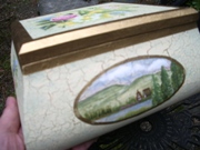小箱 クラッキングした上に絵を描くときは、クリアクレージングを厚く塗っておくと描きやすいです。 サイドには五箇山合掌造りの風景を入れてみました。 |
