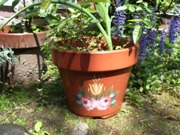 植木鉢に描くときは鉢の表面をサンディングします。 ニスはかけなくて、水洗いもできます。 |