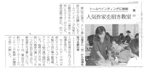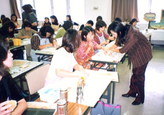 | 古屋加江子富山セミナー 1999年10月13日 富山県民会館 セミナー受講の皆様ありがとうございました。 お疲れさまでした。 そして陰で支えて下さった皆様方ありがとうございました。 いくら富山出身の方とはいえあまりにも大物ペインターのセミナーということで また大人数(60名)なのでハートローズはとてもびびっていました。 でも皆様方のあたたかいご支援のもと無事富山セミナーを終わらせていただきまし た。(ホッ) 古屋先生は富山は30年ぶりということでとてもなつかしく思って下さいました。 特に富山の食べ物の話には花が咲きました。 セミナーでも富山ということでとても大きな素材を使って下さり特別に書き下ろし の富山作品を描いて下さいました。 先生の作品も数多く持ってきて下さりカメラでの撮影も許可してくださいました。 異例の多い富山セミナーでした。 サイン会には長い行列ができましたが最後の方にまでつきあってくださり受講生の 方々からは *やさしくて素敵な先生 *はじめてセミナーというものに出ましたが本当に楽しかった *テレビモニターが4台も入りとてもよくわかりました *富山でセミナーを受けれるなんて夢のよう *初心者ではじめてのセミナーで心配していましたが思っていたより描けたのでう れしい 等々主催者にとってうれしいアンケート結果とメールを頂きました。 会場での受講生の皆様方本当に笑顔で和やかでした。 古屋先生もお二人のアシスタントの先生方もとってもやさしい素敵な方々で会場の都合で 通常のセミナーより時間が少々短かったのでお食事中もサインやツーショットにも 応じられ主催者は恐縮してしまった一幕もありました。ちなみに当日の昼食は「富 山のます寿司とかまぼこ」でした。 作品がおわり先生が「今日の作品以外でも何か質問ありませんか?何かやってみま しょうか?」とおしゃったのにどなたも質問なさいませんでした。もったいない。 やっぱり富山の女性はおとなしいんだわ。 ともあれ古屋先生お忙しい中ようこそ富山においでくださいましてありがとうござ いました。 村橋祥子 |