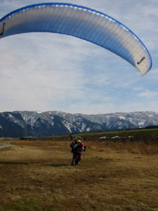 最初のタンデムは獅子吼のB級生川島さん。後ろの山はテイクオフも真っ白の獅子吼高原。 |