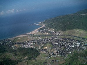| 右下には海岸を埋め立てて作った道の駅「赤神」です、中央に見えるのはが公共の施設かな? | ![]() |